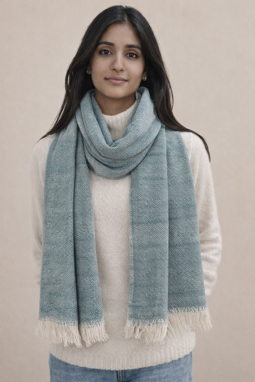 This elegant handwoven stole in Muted Teal Blue colour is made from a soft premium fibre blend, offering gentle warmth and a smooth, comfortable feel. Lightweight yet cosy, it drapes beautifully and pairs effortlessly with both everyday and festive looks. Perfect for the conscious consumer who values sustainability without compromising on style.