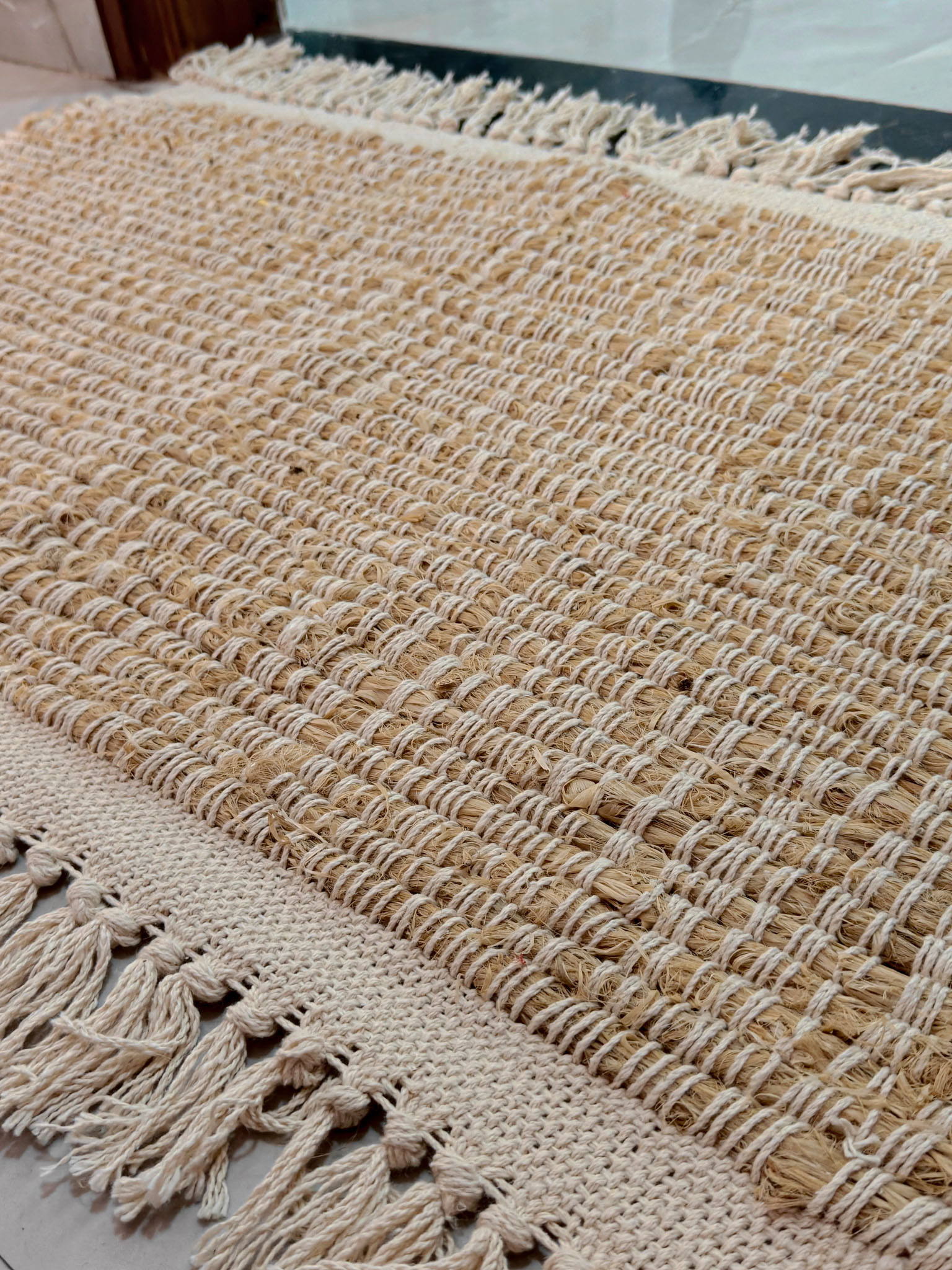 Handcrafted from natural Bhimal fibre, this organic doormat is made by skilled rural artisans, making each piece unique in texture and character. Stronger and more breathable than conventional synthetic doormats, Bhimal fibre is naturally antimicrobial, highly durable, and ages beautifully with use. The firm yet comfortable weave effectively traps dust while remaining gentle on bare feet, and the soft cotton fringes add a warm, earthy aesthetic to your entryway.