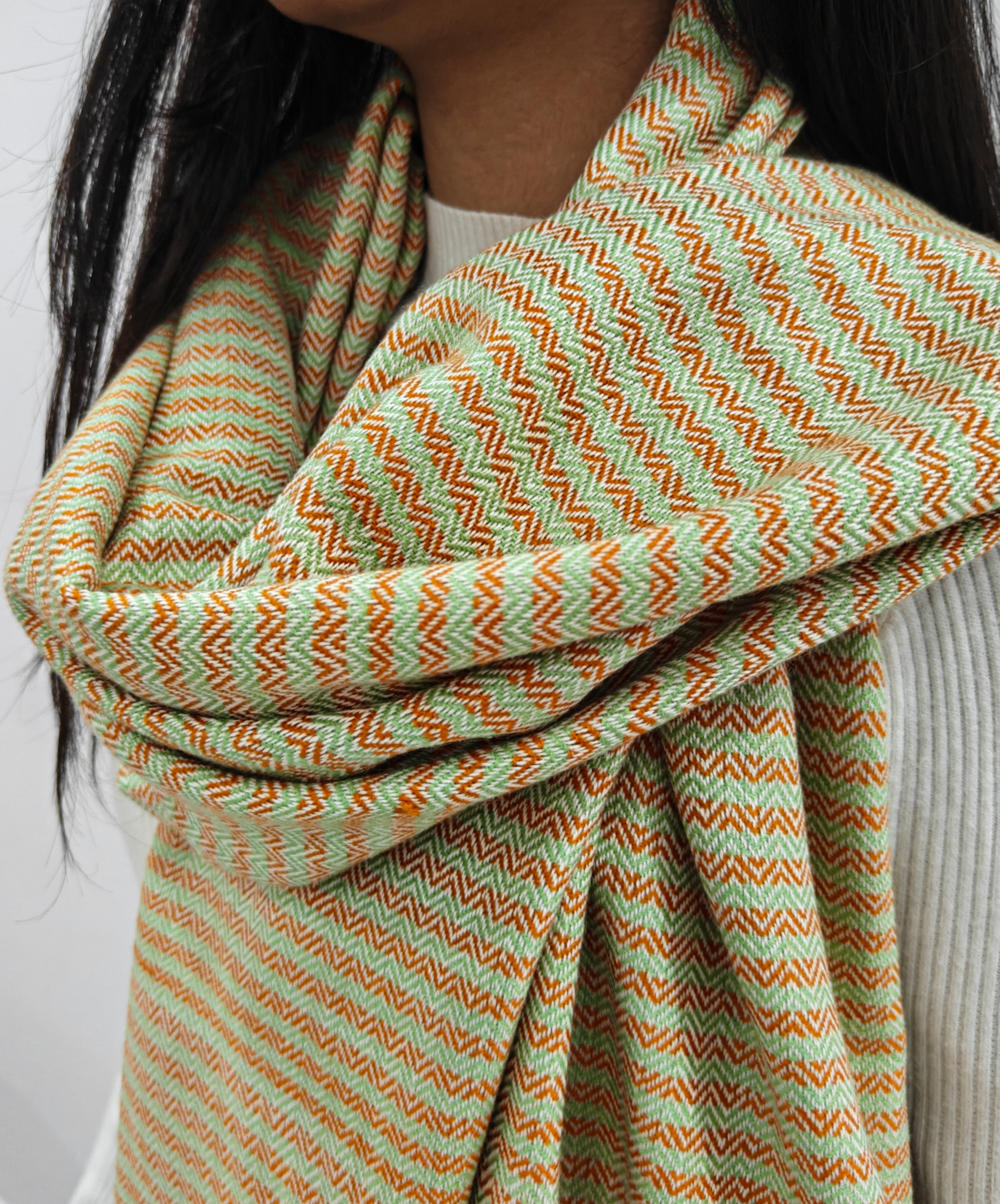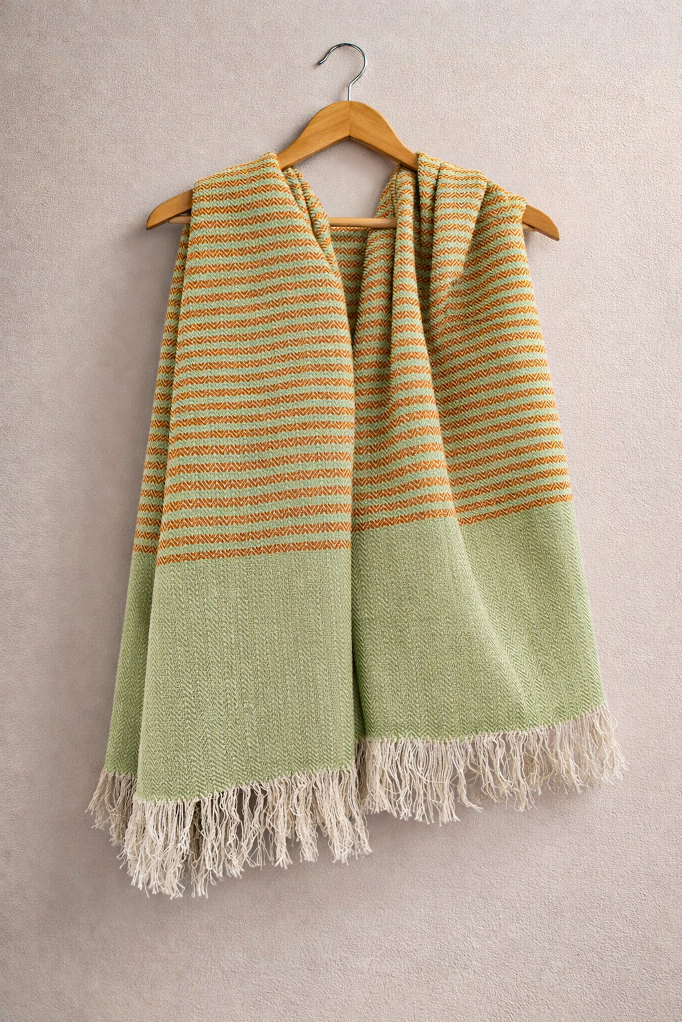 This elegant handwoven shawl in Pistachio Green and Orange colour is made from a soft premium fibre blend, offering gentle warmth and a smooth, comfortable feel. Lightweight yet cosy, it drapes beautifully and pairs effortlessly with both everyday and festive looks. Designed for durability and long-lasting use, it is a thoughtfully crafted, low-maintenance piece for mindful, everyday styling.