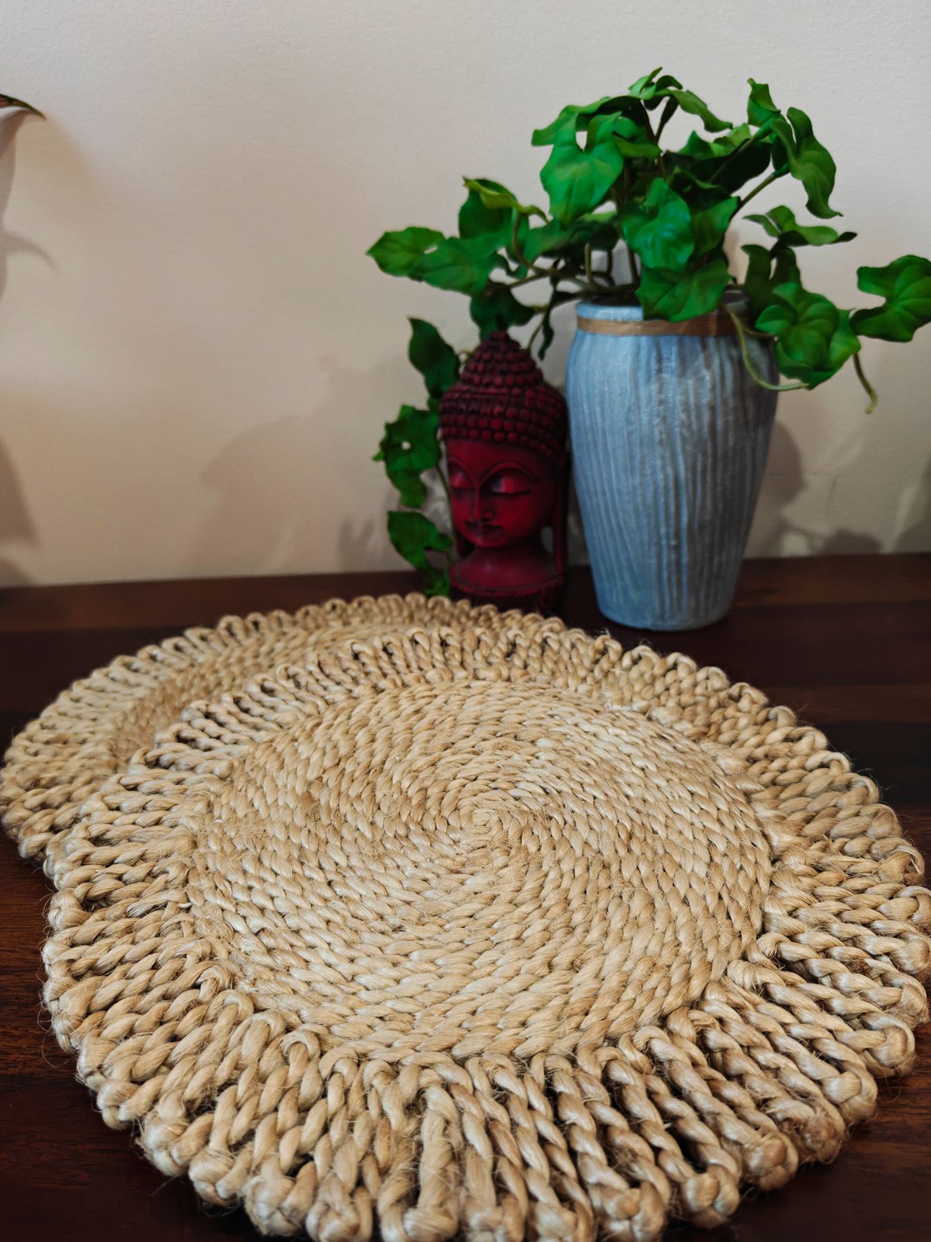 One mat, endless uses. 🌿 Whether you need a rustic base for your favorite indoor plant, a spot for your Buddha statue, or a heat-proof mat for your Sunday roast, our handmade jute placemats have you covered.