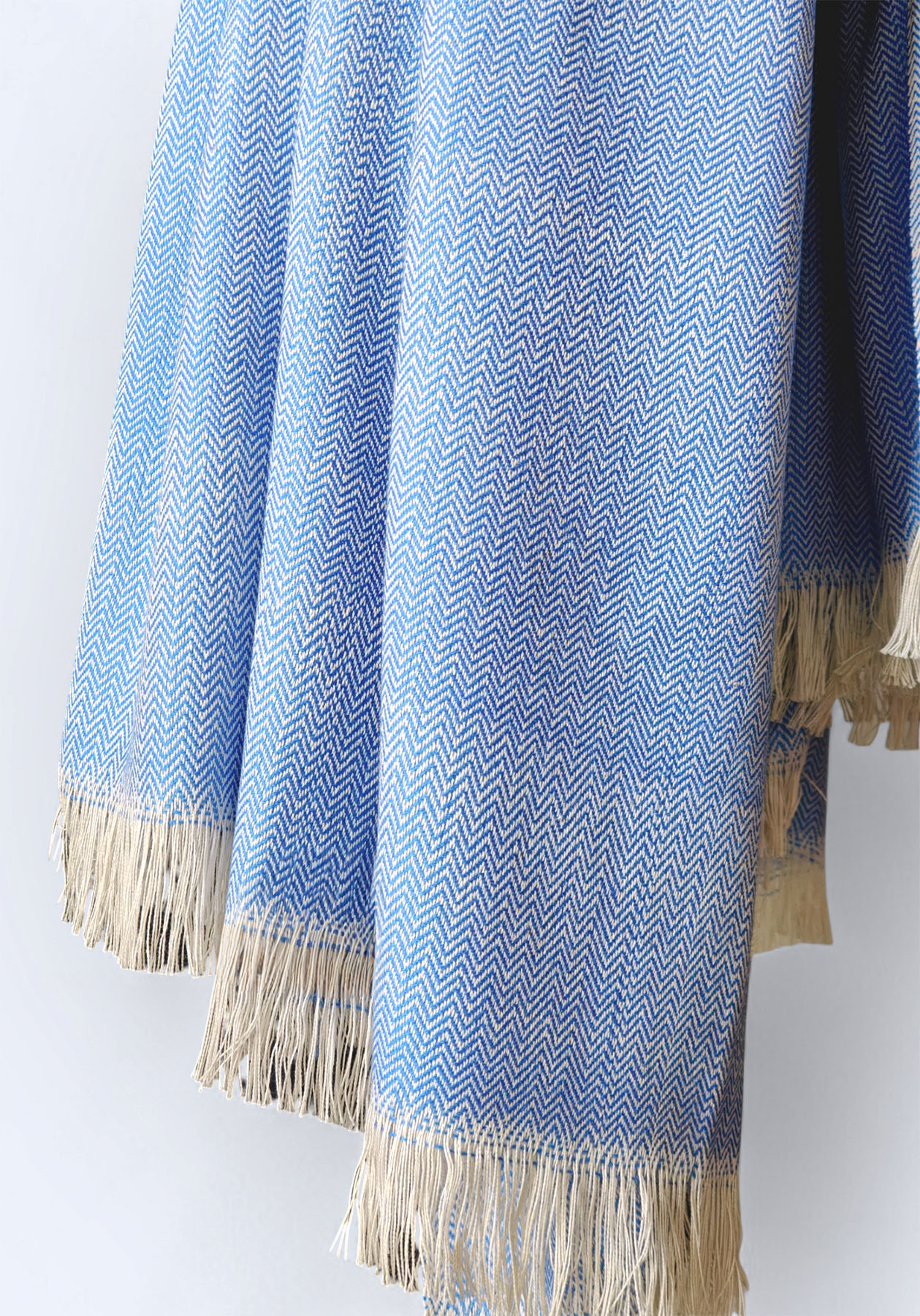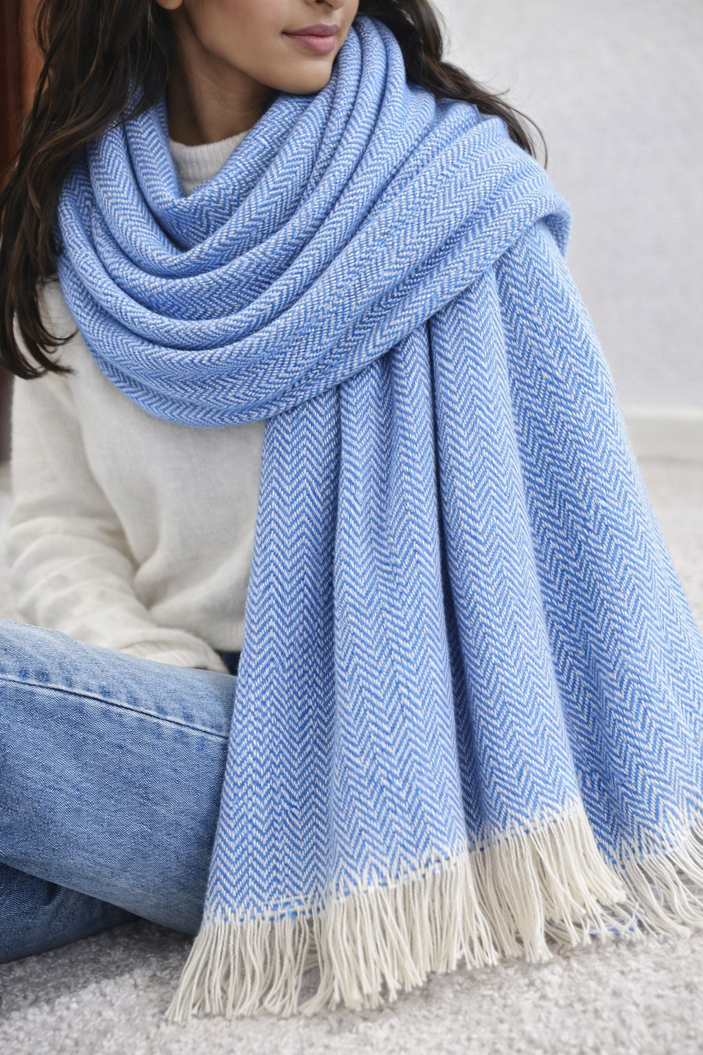 This elegant shawl in Soft sky Blue and white is handwoven in timeless herringbone pattern with ivory accents and finished with natural fringed edges. It is  made from a soft premium fibre blend, offering gentle warmth and a smooth, comfortable feel. Lightweight yet cosy, it drapes beautifully and pairs effortlessly with both everyday and festive looks. Designed for durability and long-lasting use, it is a thoughtfully crafted, low-maintenance piece for mindful, everyday styling.