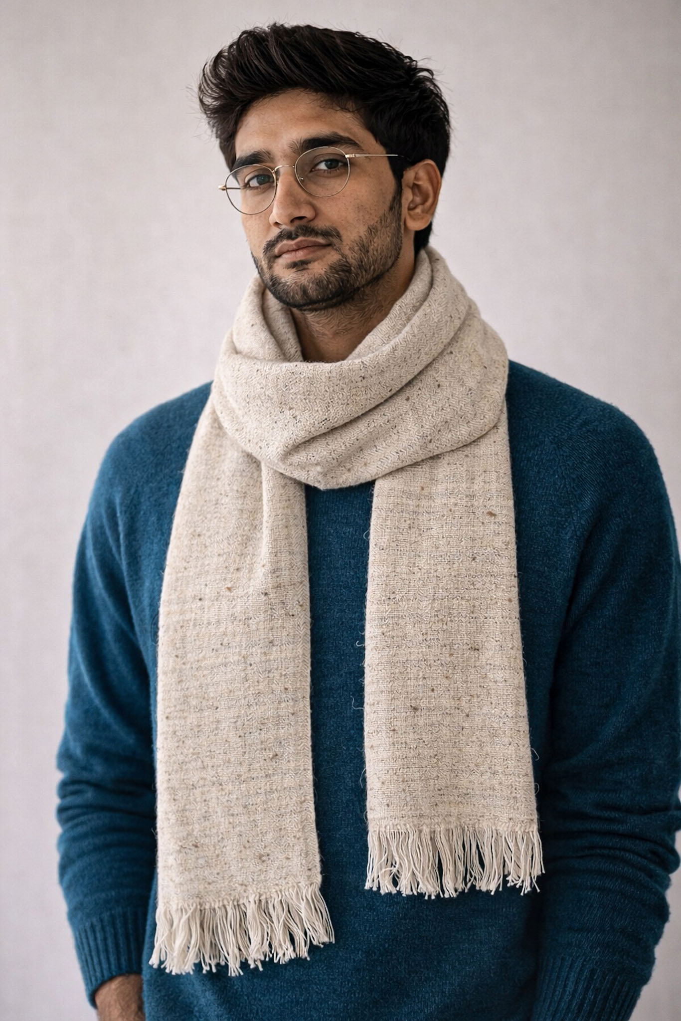 Wrap yourself in the untouched beauty of nature. This muffler is crafted from 100% natural Nettle fibre, offering a texture that is breathable, skin-friendly, and incredibly warm. Its neutral, earthy tone makes it a versatile accessory that pairs effortlessly with both Indian ethnic wear and modern winter outfits. Whether you are heading to the office or a casual evening out, this muffler adds a touch of understated elegance to your look.
