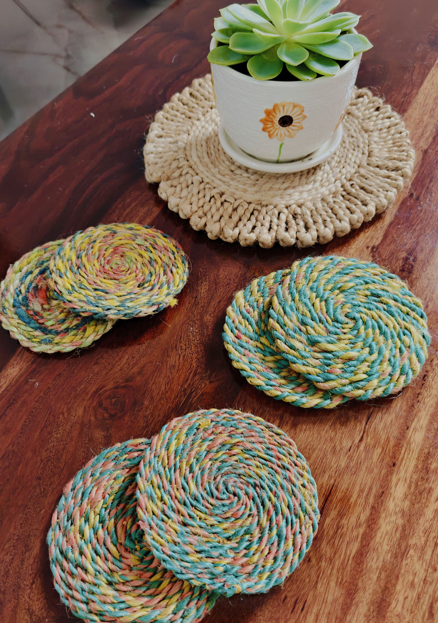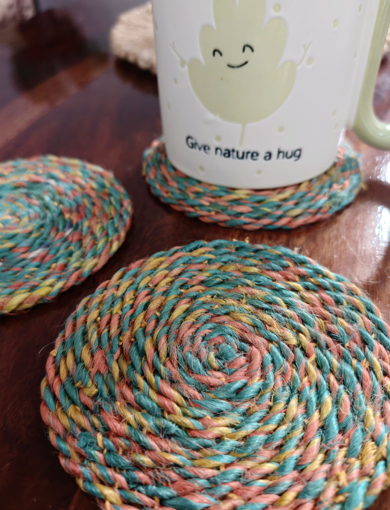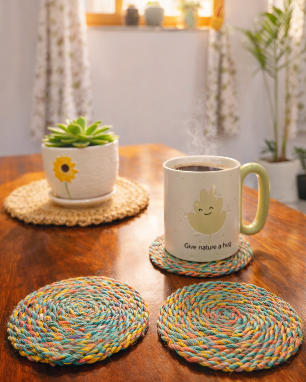 These handmade jute coasters feature a tightly braided pattern crafted by hand using natural jute fibres, giving each piece a rustic yet refined character. Made from organic, biodegradable material, they are sturdier and more heat-resistant than regular synthetic coasters, protecting your surfaces from hot mugs and moisture while adding earthy warmth to your table. The coarse jute texture also provides a better grip, reducing slips compared to smooth coasters.