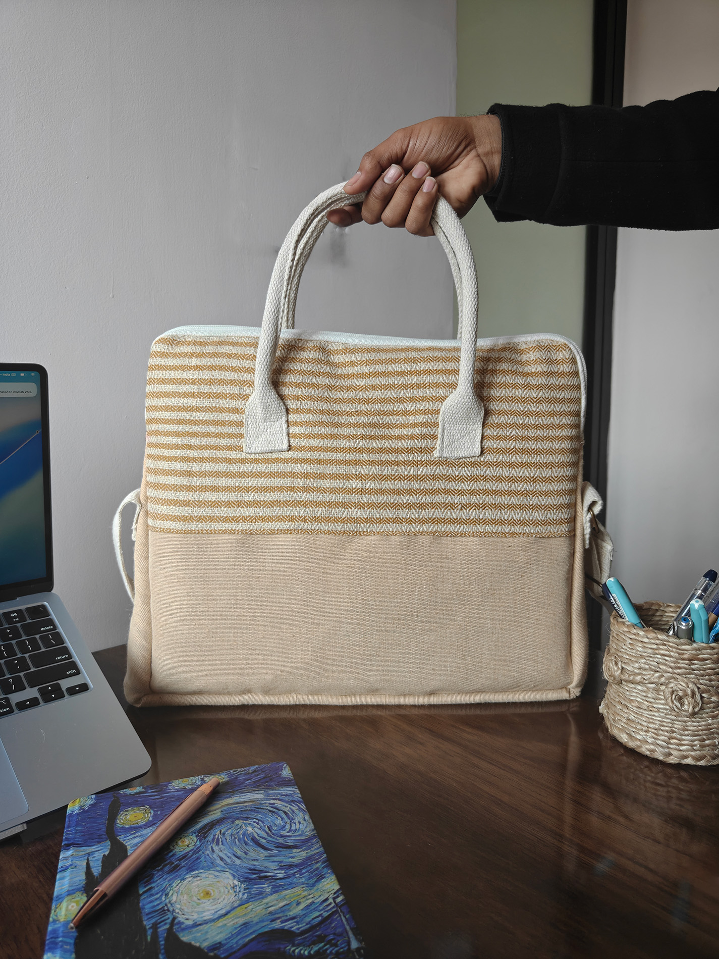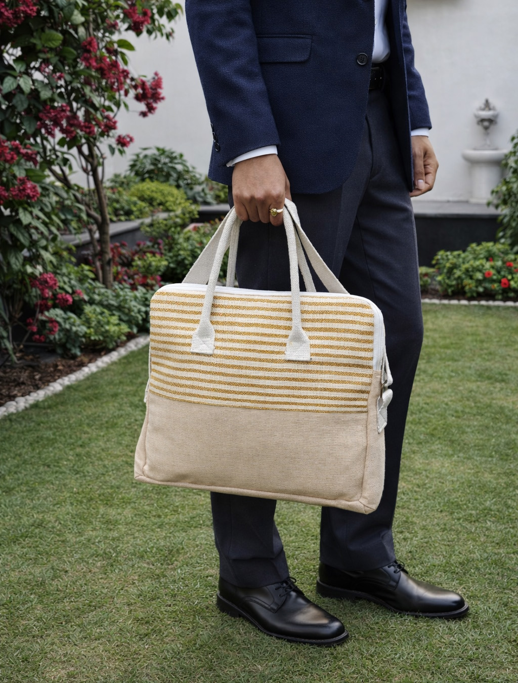 Crafted for modern professionals/students, this laptop/executive bag blends sustainability with understated elegance. Made from Woolenised jute and cotton, it features a refined textured exterior that is durable, lightweight, and visually distinctive.
