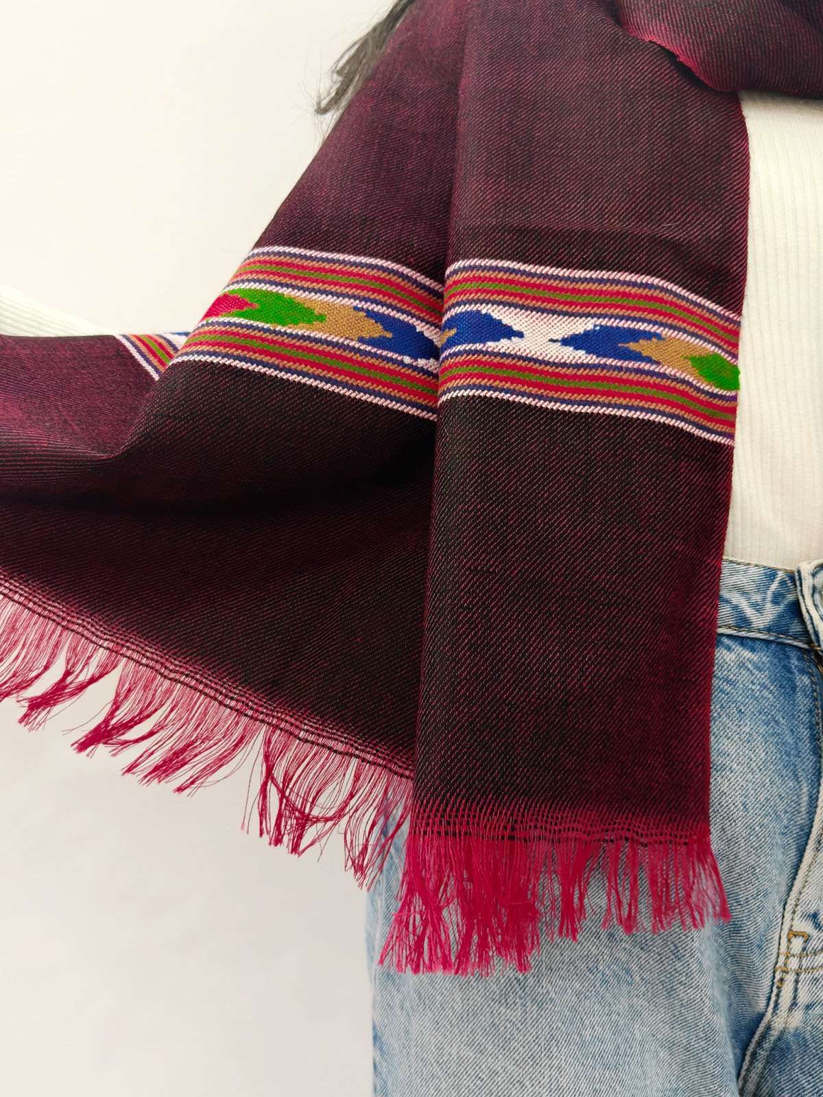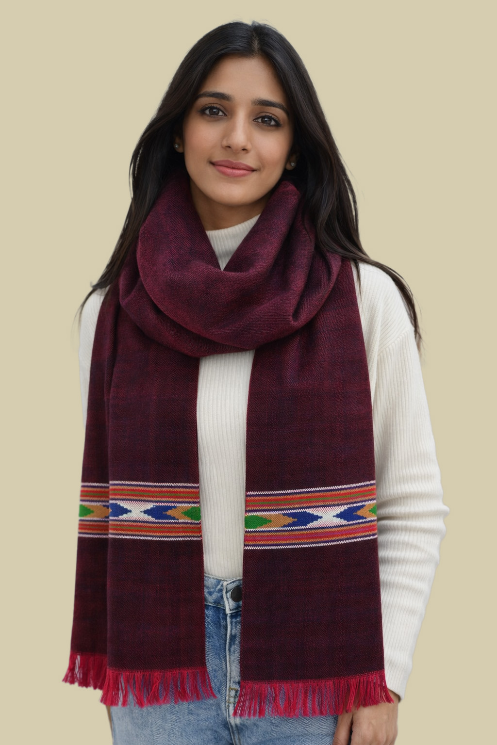 This elegant handwoven stole is crafted from 100% Merino wool, offering a soft, lightweight, and naturally warm feel. The rich burgundy colour is complemented by a traditional multicolour woven border, adding a subtle artisanal touch. Finished with natural fringes, it is ideal for everyday wear as well as special occasions.